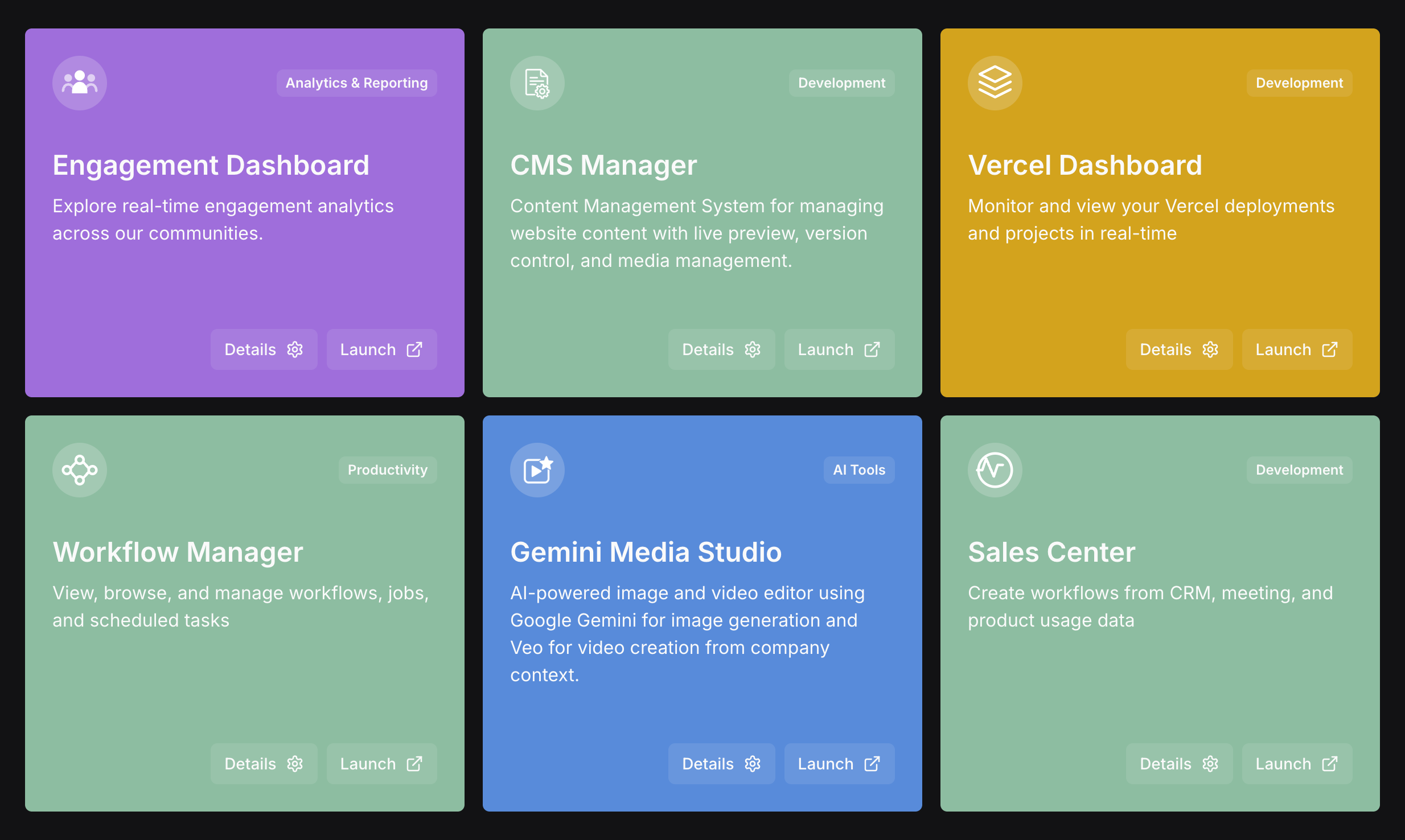 When one team builds an app, every other app and agent can consume it's functionality. A reporting app built last month becomes a data source for next week's dashboard. Each deployment adds capabilities that compound across your organization.