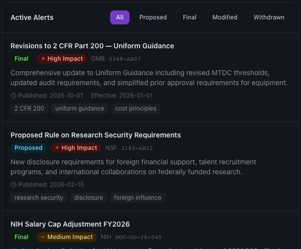 Set up alerts for regulatory changes in your domain. When a rule is proposed or finalized, your team knows immediately, not after the compliance deadline.