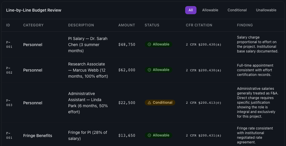 Each line item classified with the specific regulation backing the determination. Allowable, conditional, or unallowable, with the citation, not just the verdict.