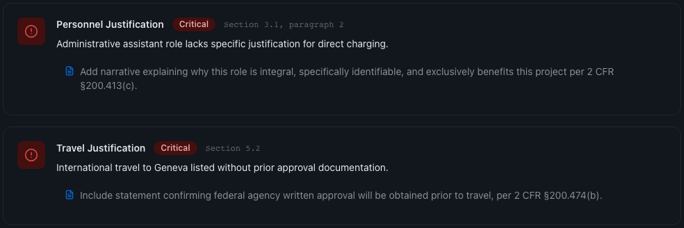 Regulated industries require line-by-line review against hundreds of rules, standards, and cost principles. Manual review is time-consuming, difficult to scale, and regulatory updates happen constantly. One oversight can mean returned funding, failed audits, or regulatory action.