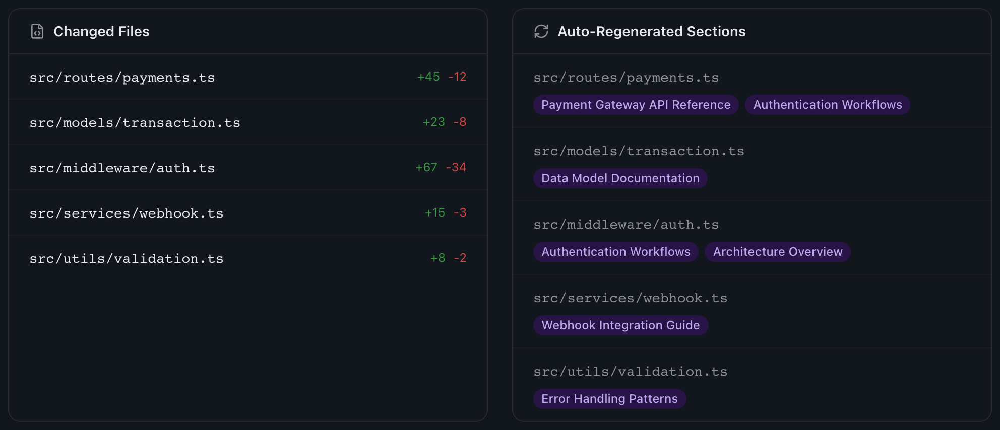 Push code. The system detects which files changed, runs a targeted diff, and regenerates only the affected sections. API changed? Docs update. New endpoint? Docs appear. Zero manual intervention.