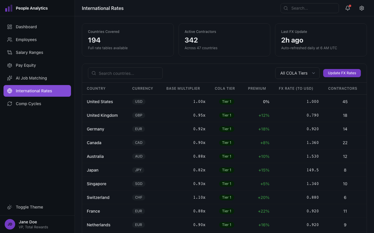 Country-specific premiums for contractors worldwide. Base multipliers, cost-of-living tiers, and exchange rates updated automatically. Track active contractors by country. Scale your global workforce without scaling your comp team.