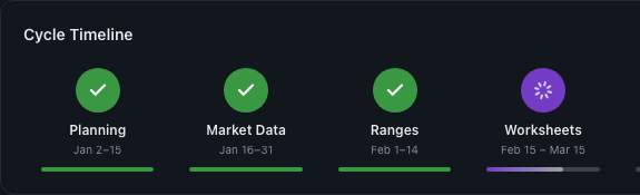 Market data updates — ranges recalculate. Employees move — positions adjust. Aging runs on schedule. Next comp cycle is an update, not a rebuild.