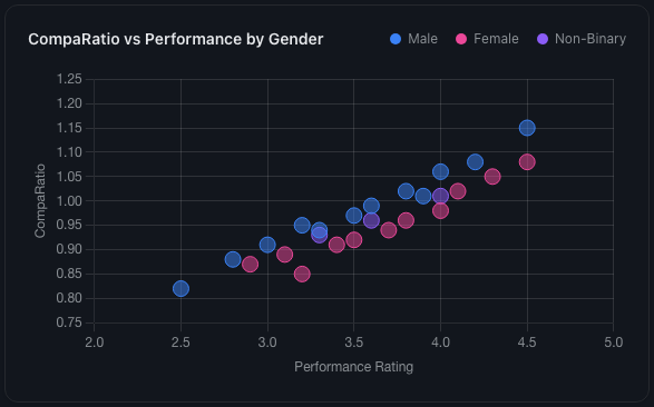 Automatic flagging when demographic pay gaps exceed configurable thresholds. Scatter plot analysis across gender and performance dimensions. Gap breakdown by department. Drill into affected employees. Dismiss with documented justification or escalate for review.