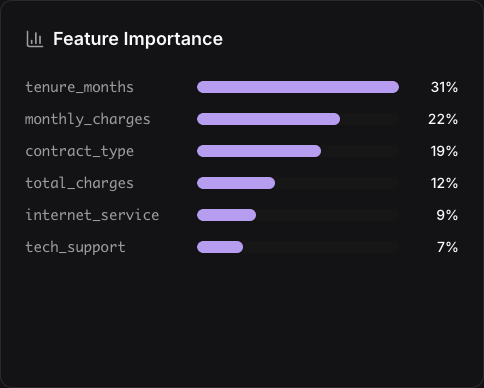 See which variables drive predictions. Is it login frequency? Time since last purchase? Support ticket volume? Rank features by importance. Build trust in the model before deploying it.