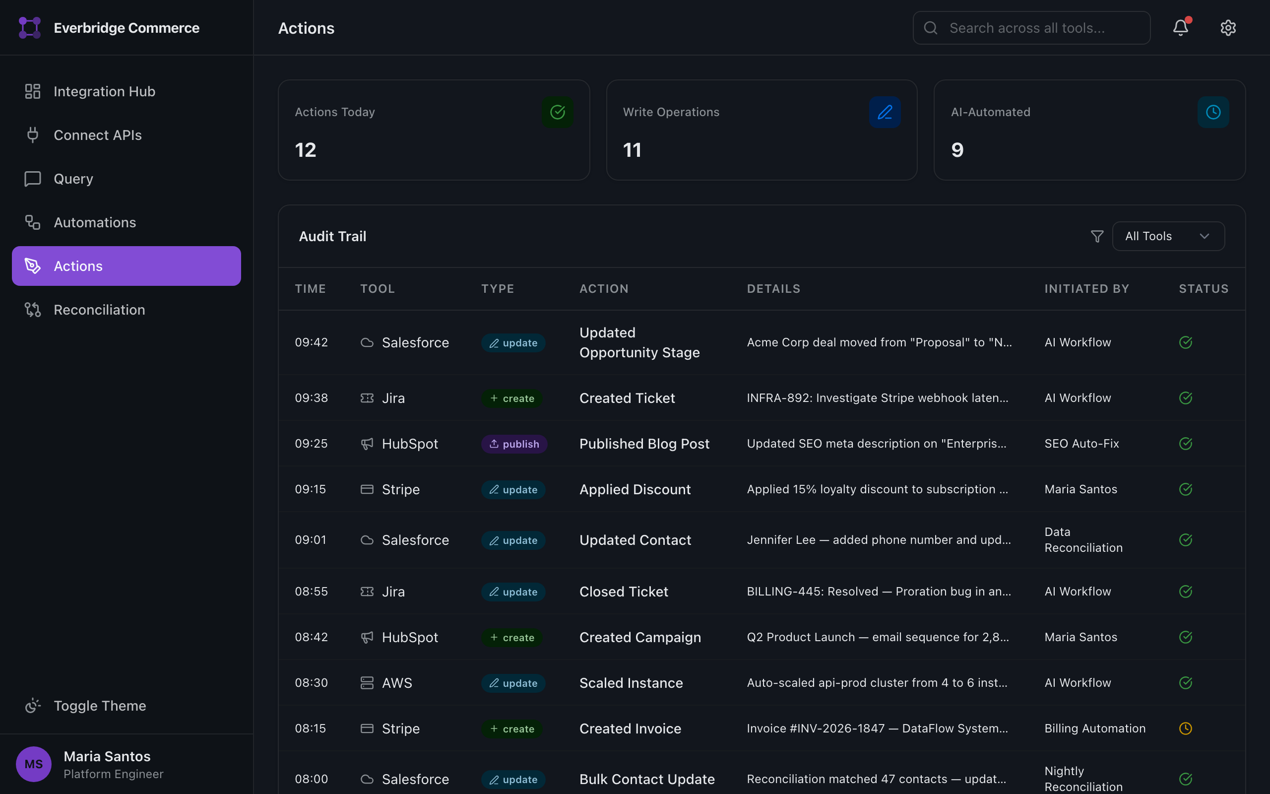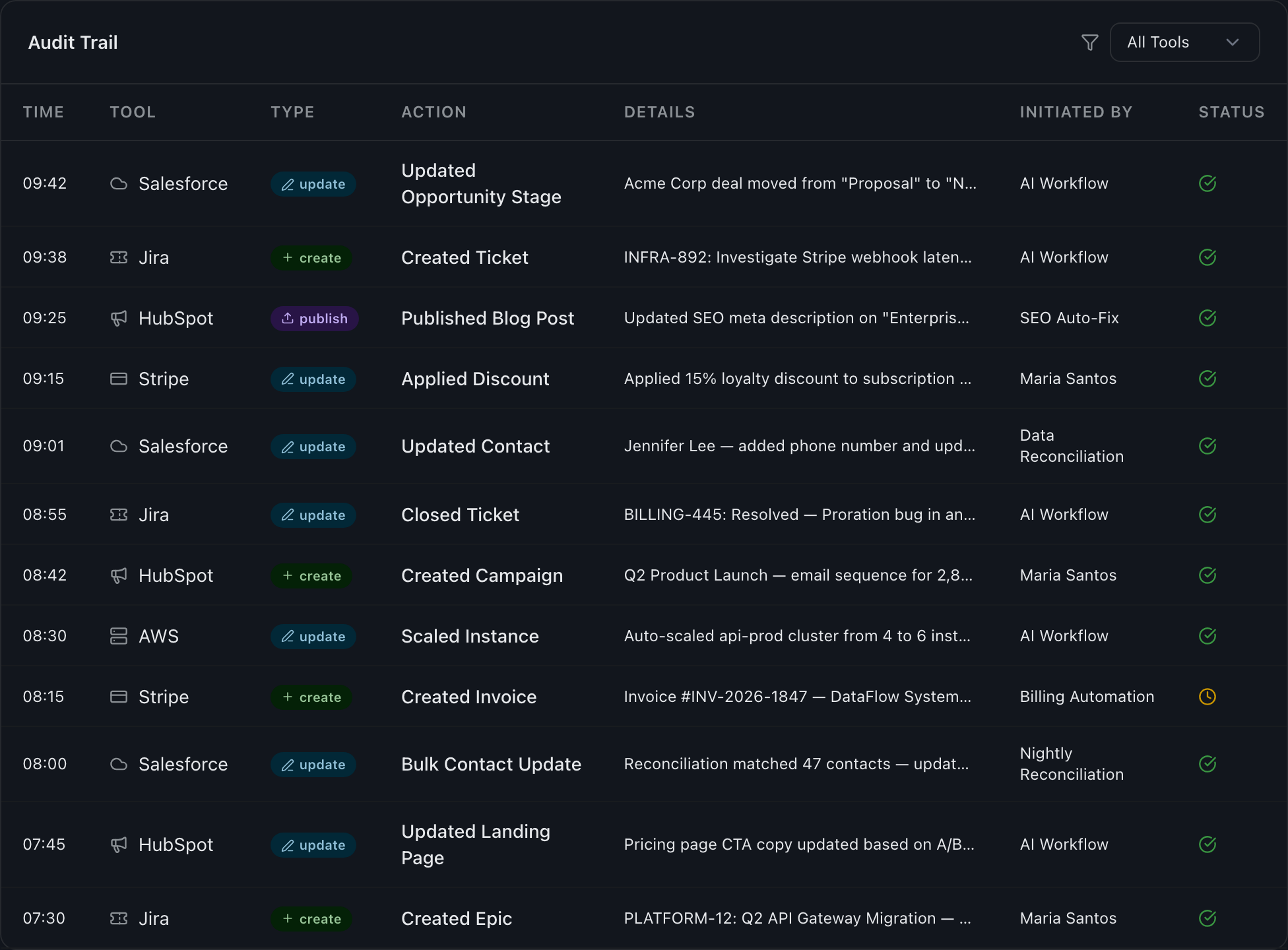 Update records, create tickets, publish content, send alerts, all from one interface. Every action logged with full audit trail. Every change traceable to its trigger.