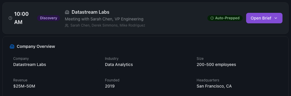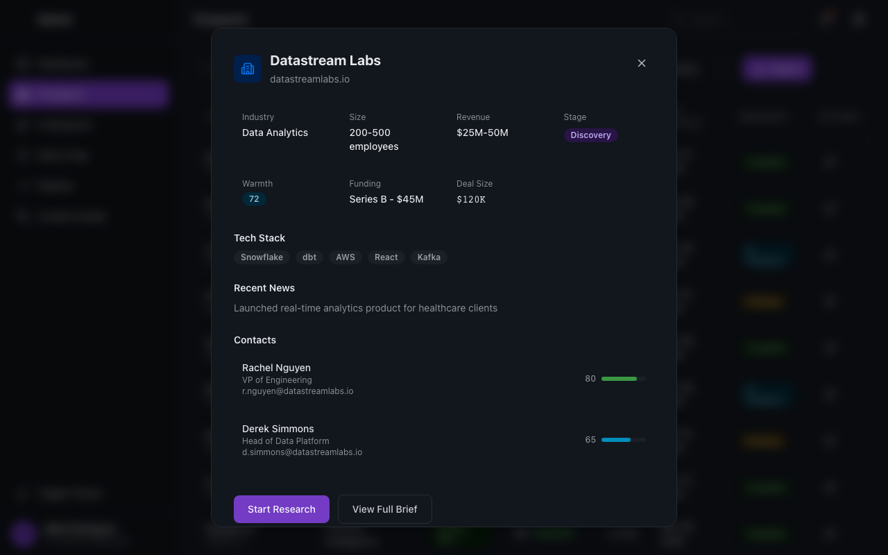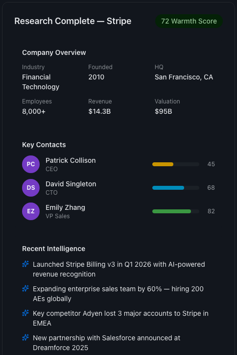 Googling. Skimming LinkedIn. Digging through PitchBook reports. Checking if anyone has a warm intro. The CRM has stale data. The marketing list has duplicates. Research workload grows linearly with pipeline, pulling reps away from selling.