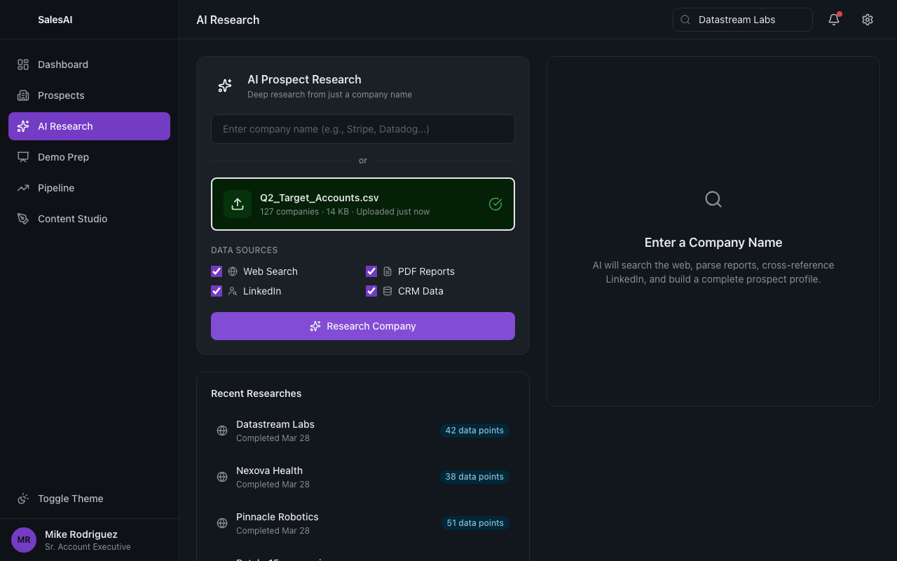 Upload from CSV, connect your CRM, or start from scratch. The AI batch-researches every prospect from just a company name.