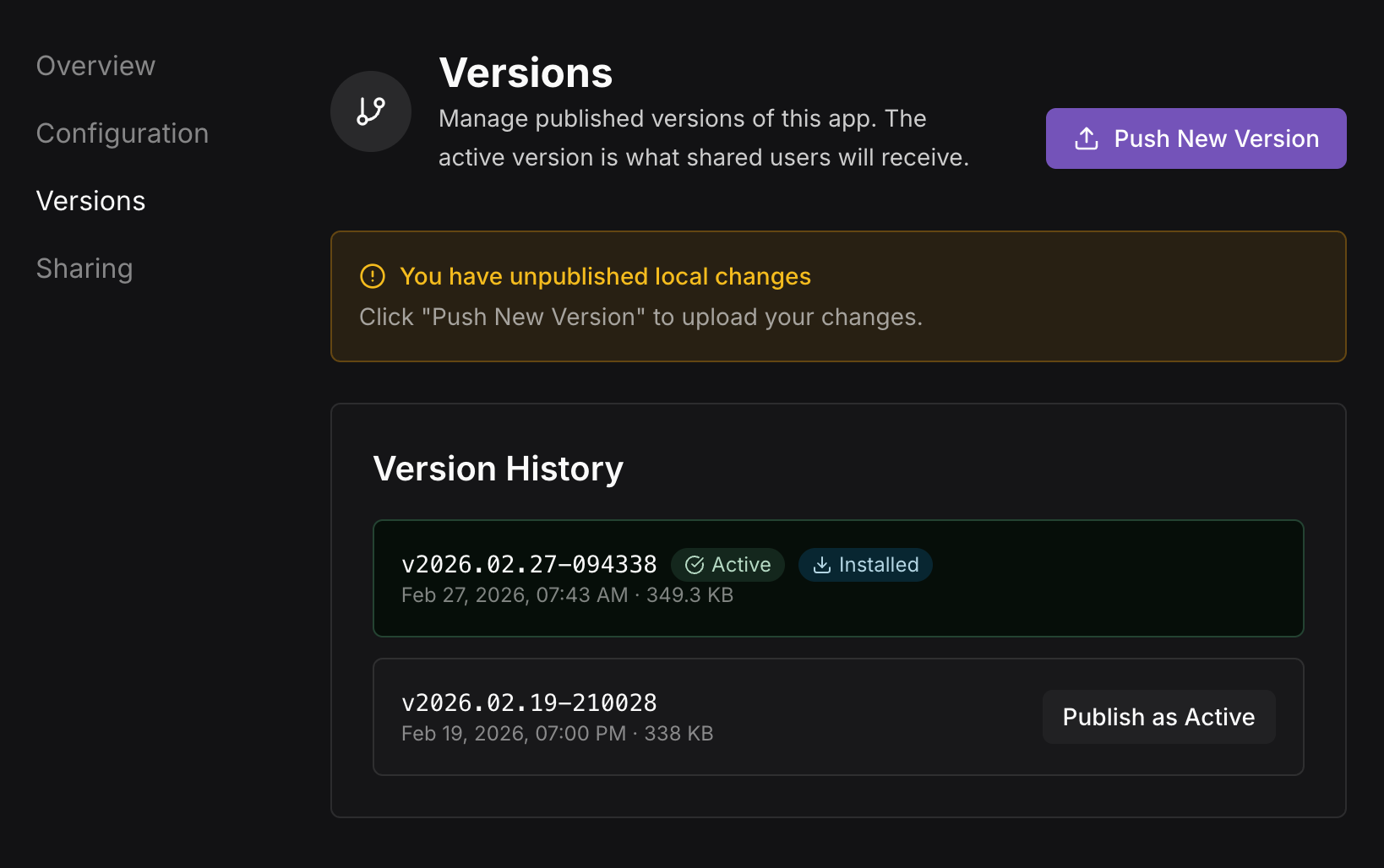 Every app and service is versioned automatically when you publish. Roll back, fork, and manage dependencies without building a release pipeline.